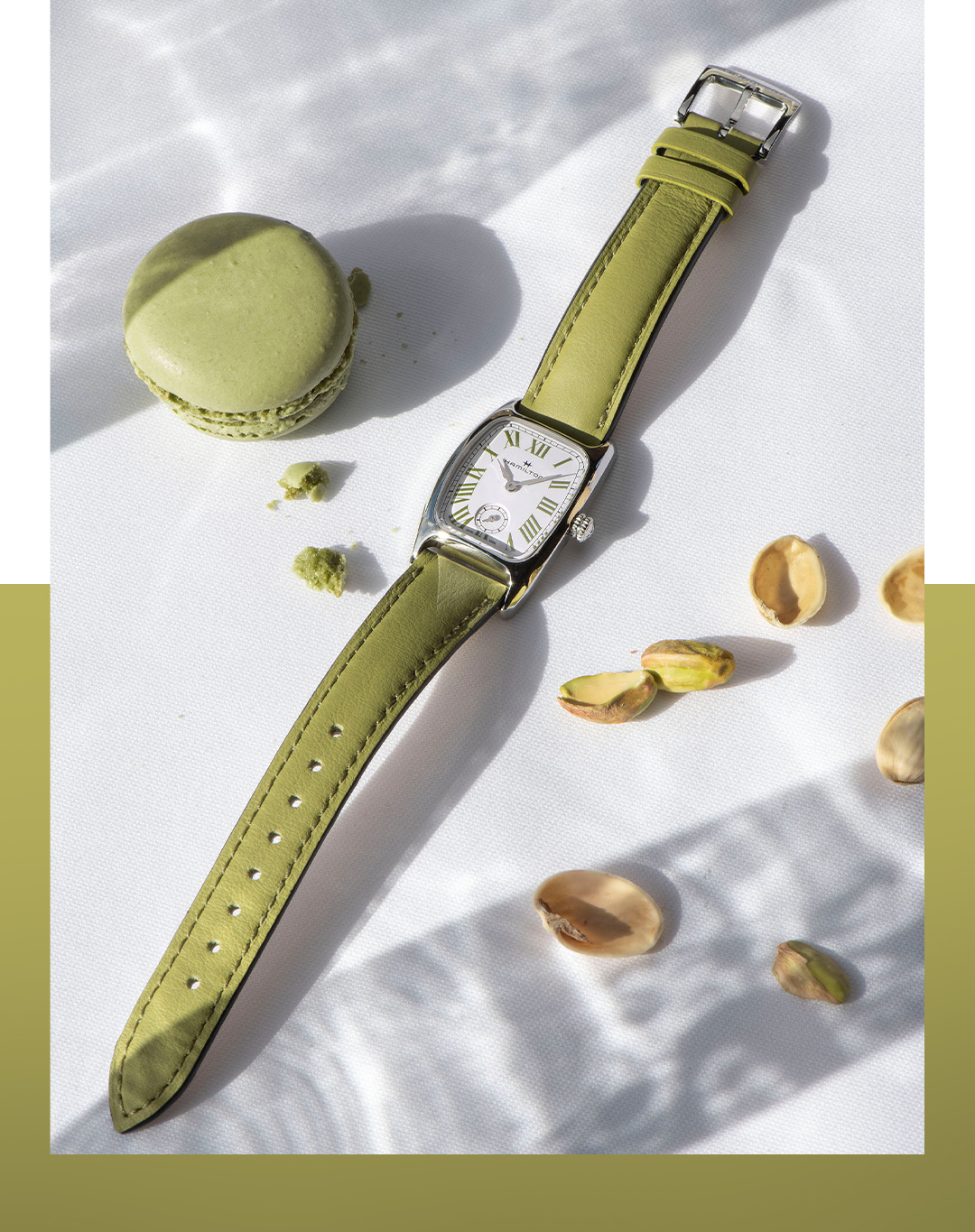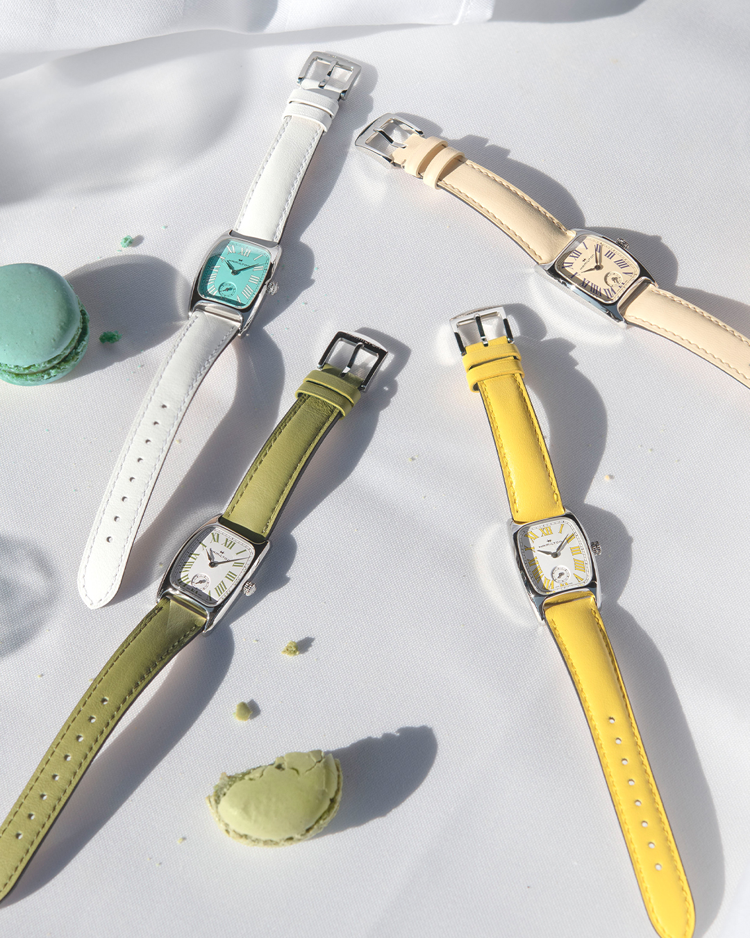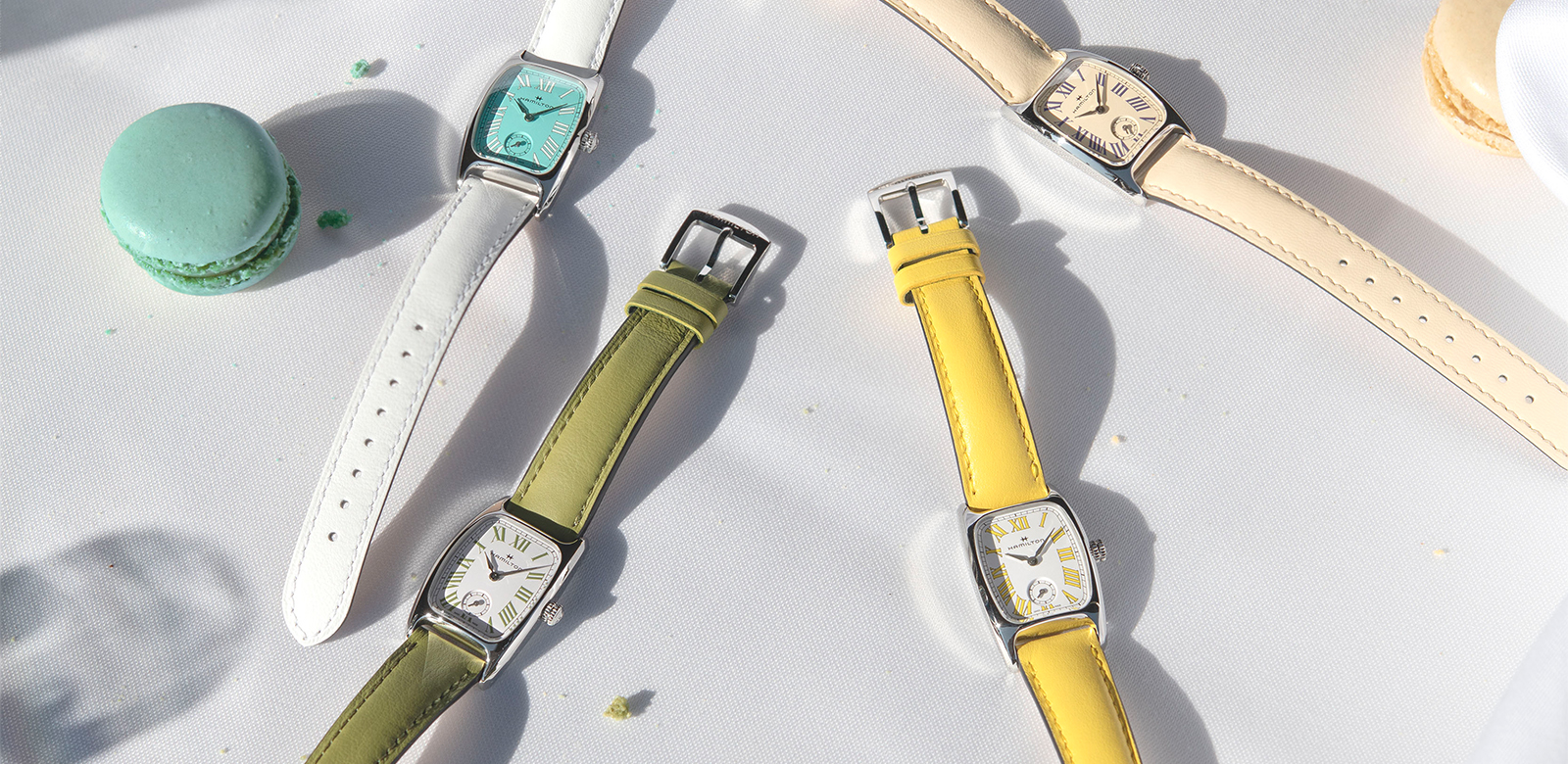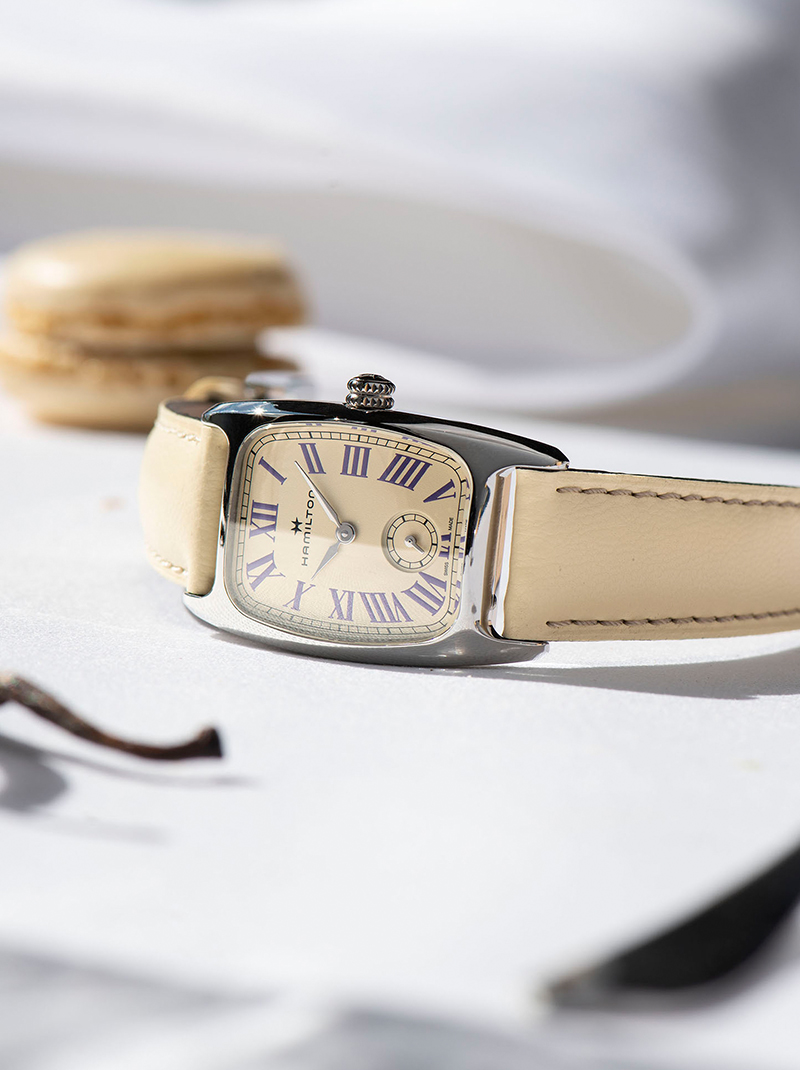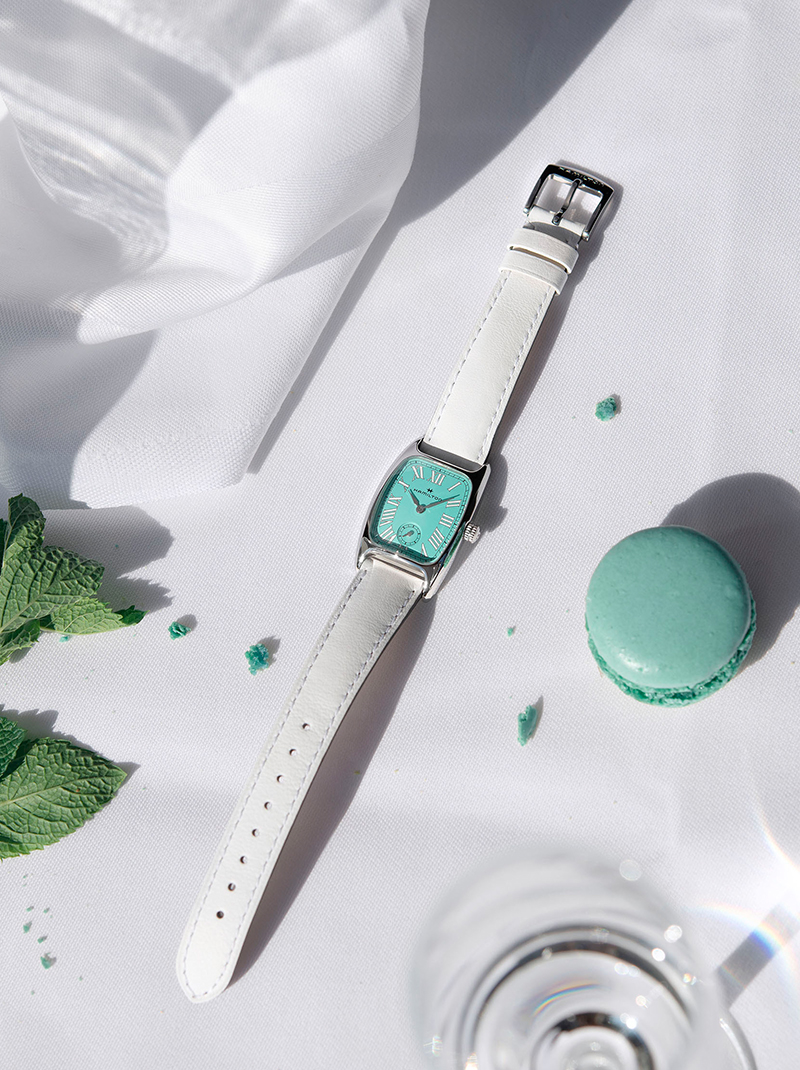 汉米尔顿伯顿腕表以四款充满活力的色调重新演绎,每种色调均从备受喜爱的马卡龙风味汲取灵感,为这款别具一格的1940年代时计注入清新隽永的女性魅力。
