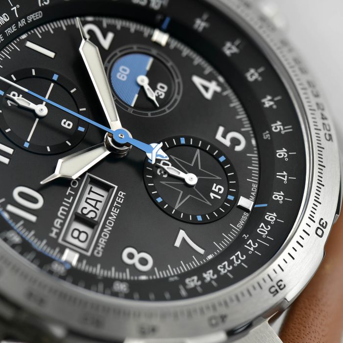 2018年卡其航空系列超越风速自动计时表限量版,设有飞行员所需的航空技术功能,并具备汉米尔顿划时代的侧风计算器。腕表限量发行1,918枚,搭载汉米尔顿首款配备硅游丝的计时机芯——H-21-Si,其精准度获瑞士官方天文台(COSC)认证为天文台表水平。