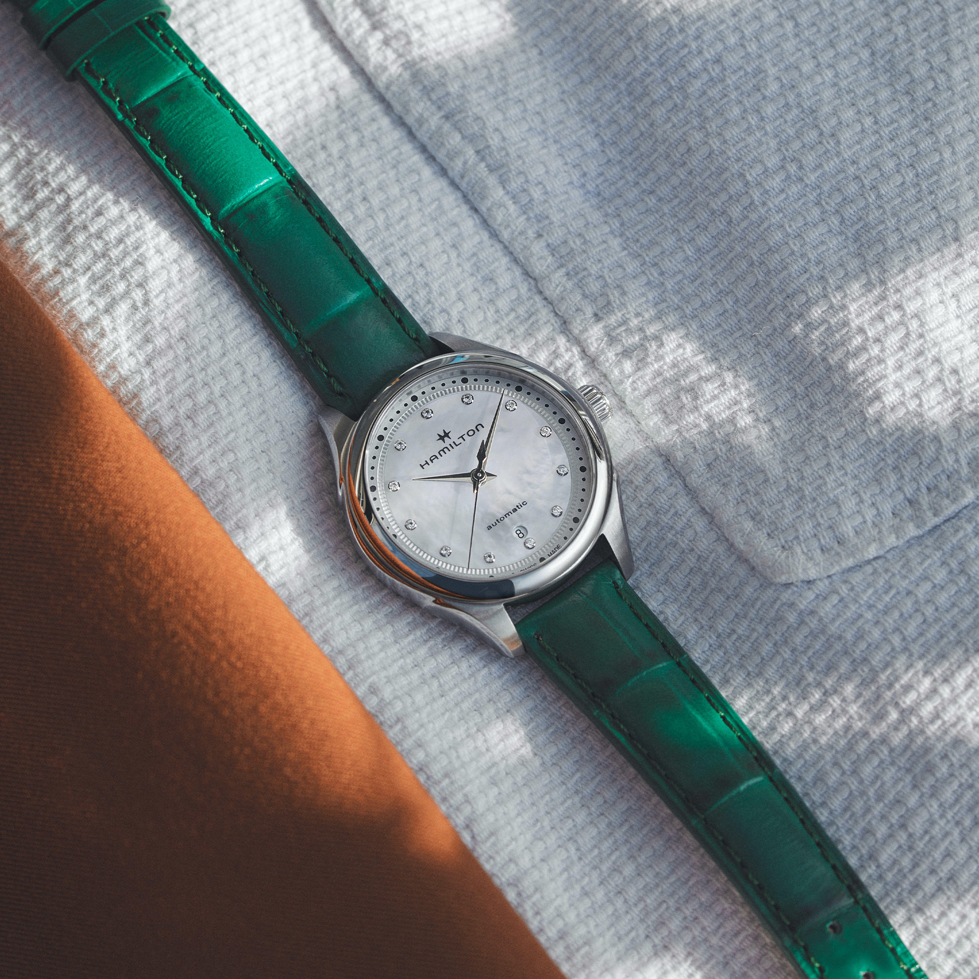 请勿错过全新推出的爵士系列女士30毫米自动腕表。珍珠母贝表盘饰以12枚钻石时标,6点钟位置上方设有日历视窗,彰显迷人的美学设计。这款优越腕表的内部搭载自动上链机芯,动力储存可达38小时,搭配绿色鳄鱼纹印花皮革表带和针扣,堪称摩登时尚、性能可靠的腕间之选。