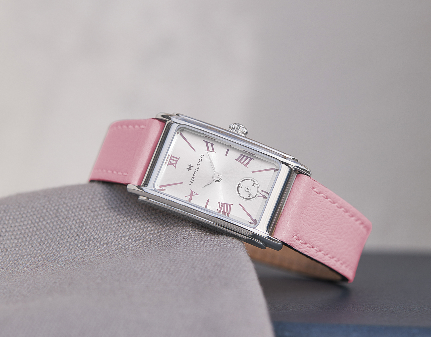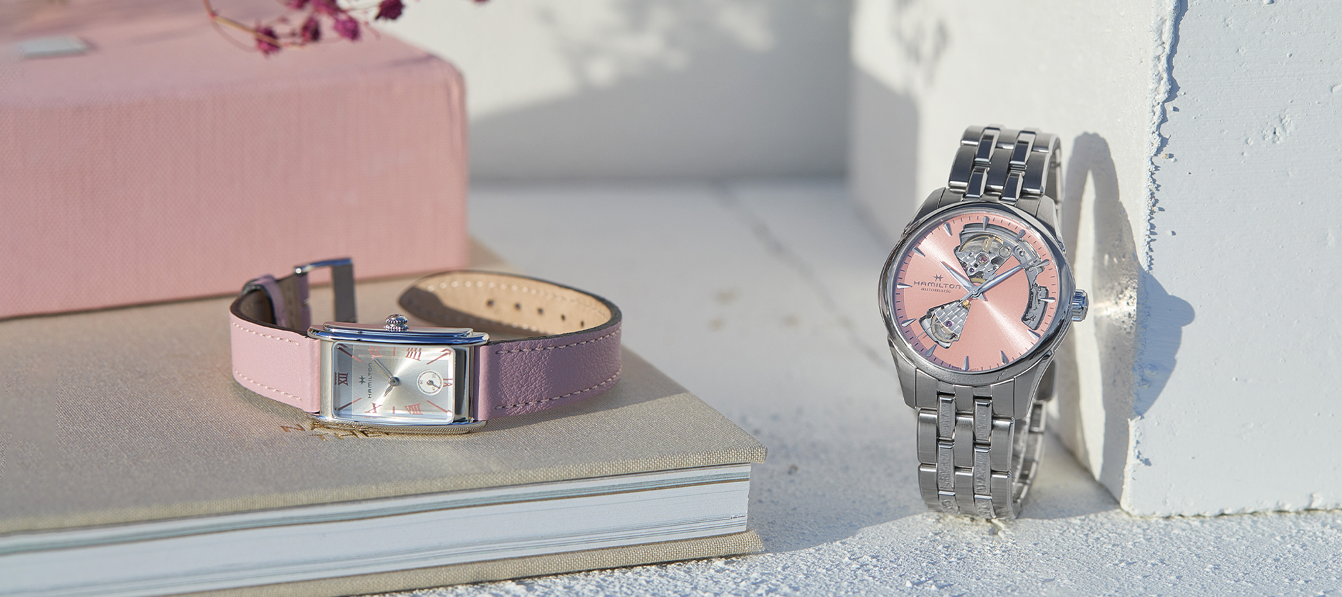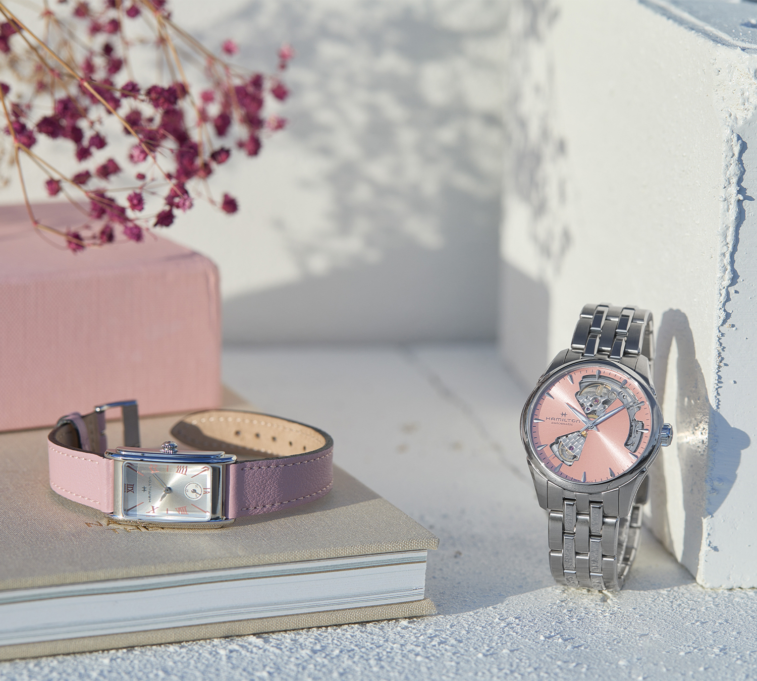 粉红色调为腕间增添精致魅力。汉米尔顿全新胶囊系列以沉着雅致的风尚融合本季活力色调。