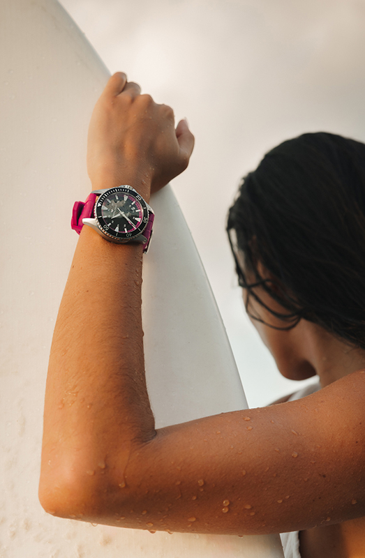 全新升级款采用了三种引人瞩目的色彩,灵感源自海滩一日。鲜亮的橙色,致敬海底鲜艳的珊瑚;而明亮的黄色,则映射着斑斓鲜活的鱼类的颜色。真正的焦点之作是洋红色表款,其灵感源自抢眼的冲浪板,让佩戴者在海滩上的快乐时光成为一场真正的冒险之旅。