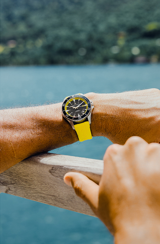 荧光黄跃然于橡胶表带和指针之上,不仅为这款深海潜水杰作增添一抹亮丽色彩,也标志着时尚风范与实用功能并进的新篇章开启。